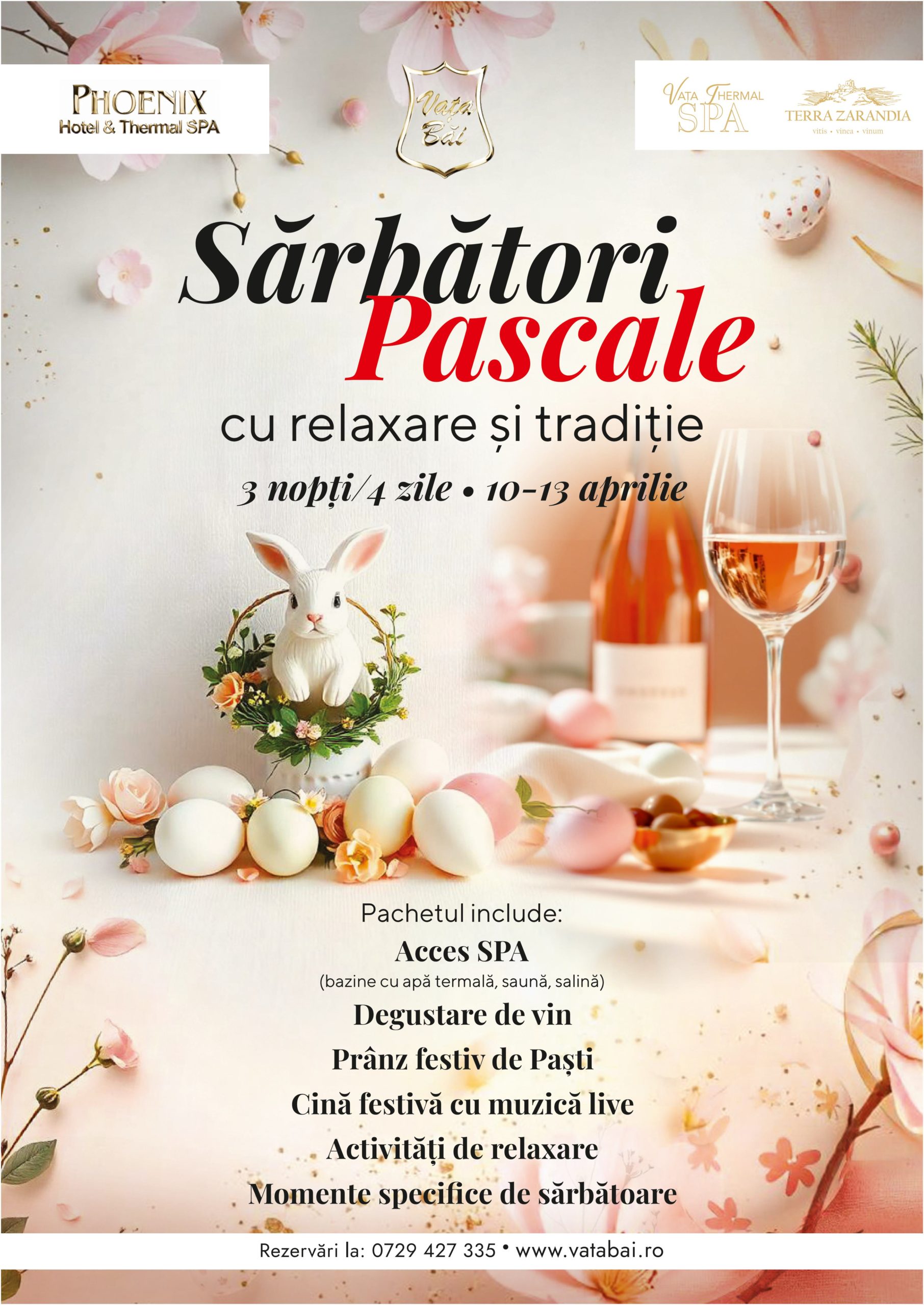 Petrece Paștele într-un cadru natural liniștit, unde tradiția se îmbină armonios cu relaxarea în ape termale. La Vața Băi te așteaptă un sejur complet, cu mese festive, muzică live și momente speciale pentru tine și cei dragi.